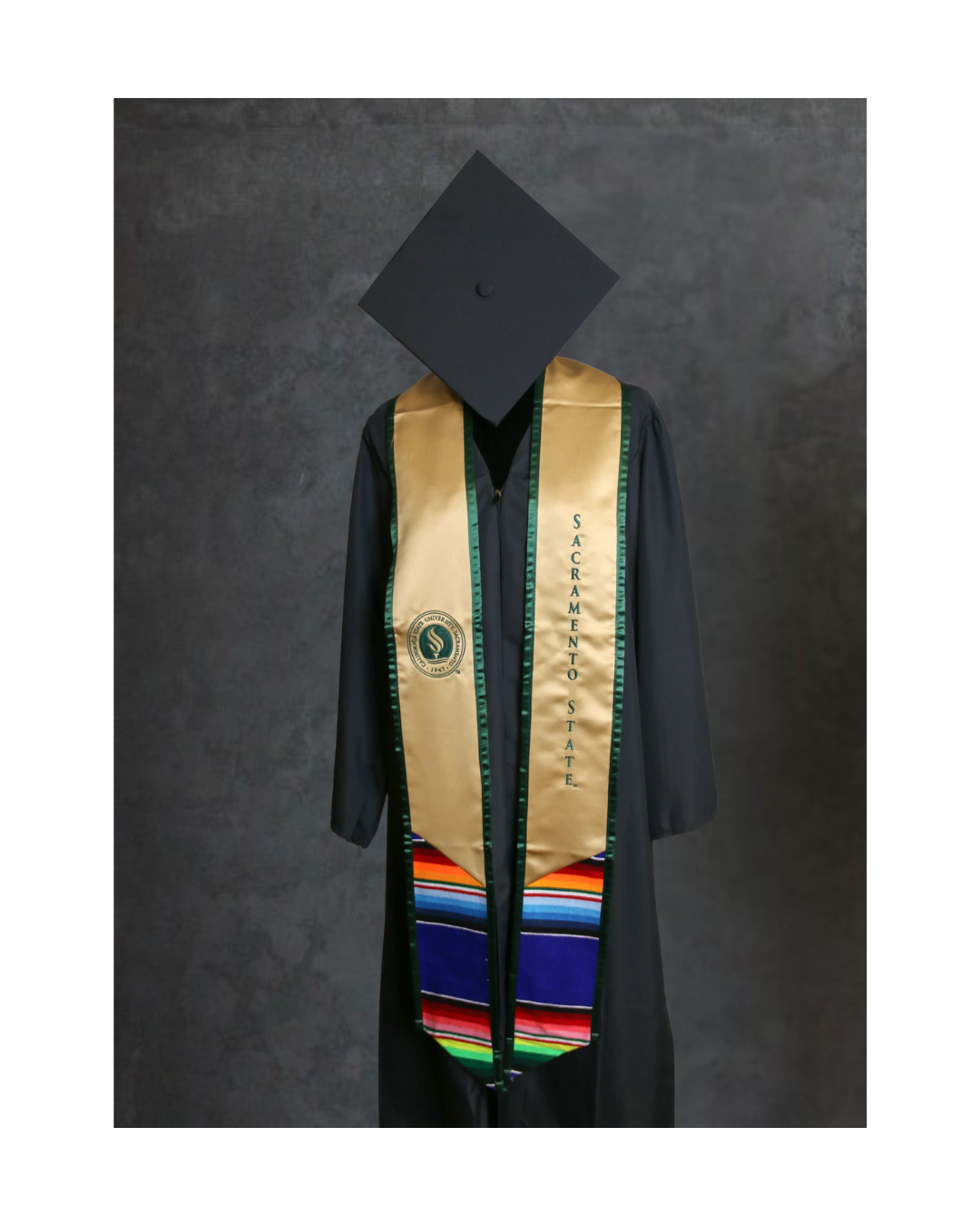 Gold Stole with Serape finishes. SACRAMENTO STATE embroidered on one side and Sacramento State logo on the other.
